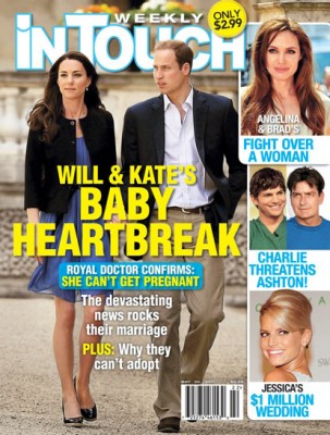 Πρωτοσέλιδο στο περιοδικό «In touch» είναι ο πρίγκηπας Ουίλιαμ και η αγαπημένη του Kate Middleton, σχεδόν ένα μήνα μετά το βασιλικόγάμο. Και αυτή τη φορά η είδηση δεν είναι καλή. Η Δούκισσα του Cambridge δεν μπορεί να κάνει παιδιά, μια είδηση, που όπως αναφέρει το περιοδικό, επιβεβαιώνει και ο γιατρός της βασιλικής οικογένειας.